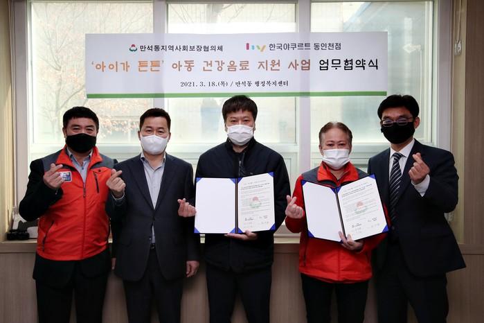 인천 동구 만석동 지역사회보장협의체는 18일 한국야쿠르트 동인천점과 업무협약을 체결하고 지역내 취약계층 아동·청소년 18명에게 주 3회 건강식품을 배달하는 ‘아이가 튼튼’ 건강식품 지원사업을 추진한다. 사진은 이날 협약식에서 허인환 구청장(왼쪽 두 번째)이 관계자들과 기념촬영을 하는 모습. (사진제공=동구청)