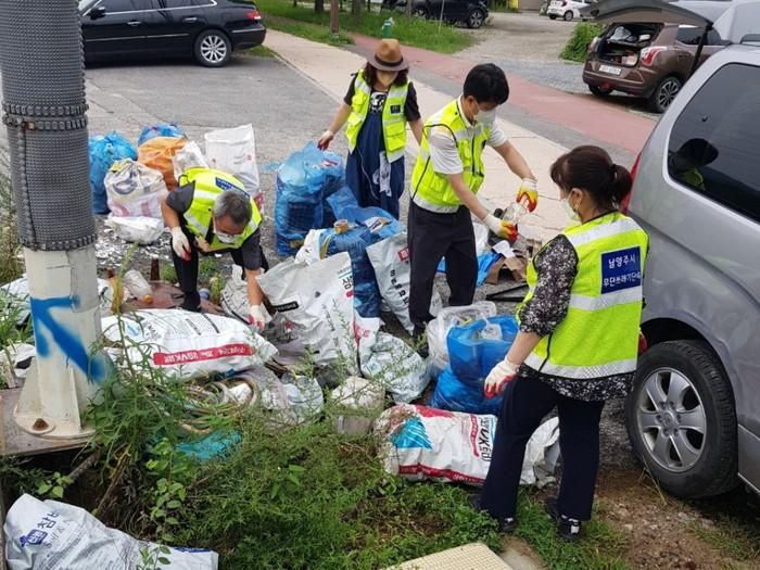 새마을교통봉사대남양주시지대는 지난 22일 경기 남양주시 별내면 청학1교 인근에서 ‘무단 투기 제로를 위한 환경 정화 활동’을 재개해 무단 투기 쓰레기 약 1톤 분량을 일일이 분리 작업한 후 수거했다. 사진은 이날 참여한 대원들이 무단투기 쓰레기를 분리수거하고 있는 모습. (사진제공=남양주시청)