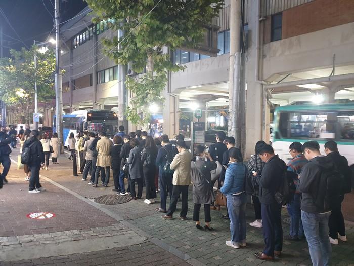 | ▲ 당산역 2번 출구 앞 버스정류소에서 광역버스를 기다리는 승객들이 길게 줄을 서 대기하고 있다.(사진제공=영등포구청) |