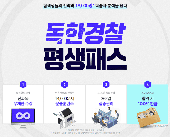 에듀윌 관계자는 "2021년까지 경찰공무원 시험에 최종합격할 경우 제세공과금을 제외한 수강료를 전액 환급해주고, 불합격시 다음 시험일까지 수강기간을 연장해주는 ‘독한경찰 평생패스’ 강의는 에듀윌 홈페이지를 통해 자세한 내용을 확인할 수 있다"고 전했다.