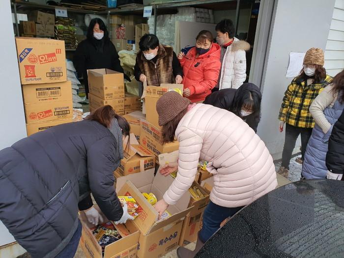 충남 아산시 온양5동 여성자원봉사단이 지난 18일 지역내 저소득 취약계층 44가구에 라면·햇반 등 식생활 용품을 개별적으로 가정방문해 전달했다. 사진은 봉사단 단원들이 대상자들에게 전달할 물품을 분배하고 있는 모습. (사진제공=아산시청)