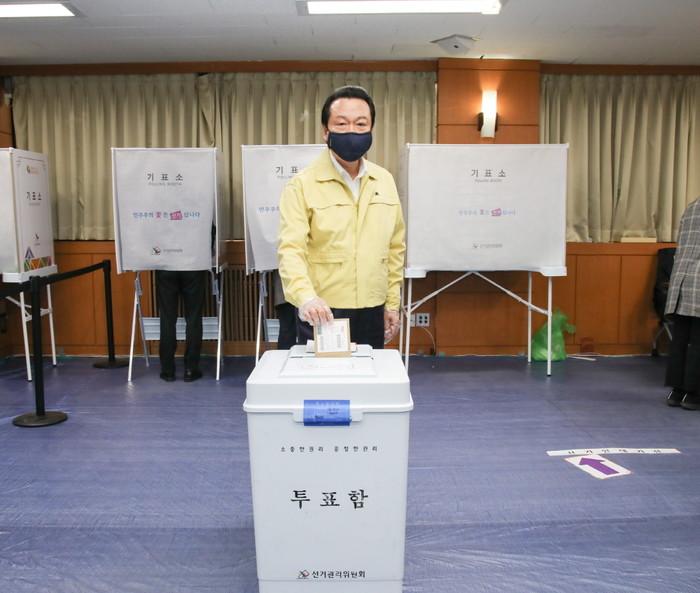 노현송 강서구청장은 제21대 국회의원선거 사전투표가 시작된 지난 10일 구청 대회의실(본관 3층)에 마련된 화곡제6동 사전투표소를 찾아 투표를 했다. 사진은 노 구청장이 투표를 마치고 투표함에 용지를 넣고 있는 모습. (사진제공=강서구청)