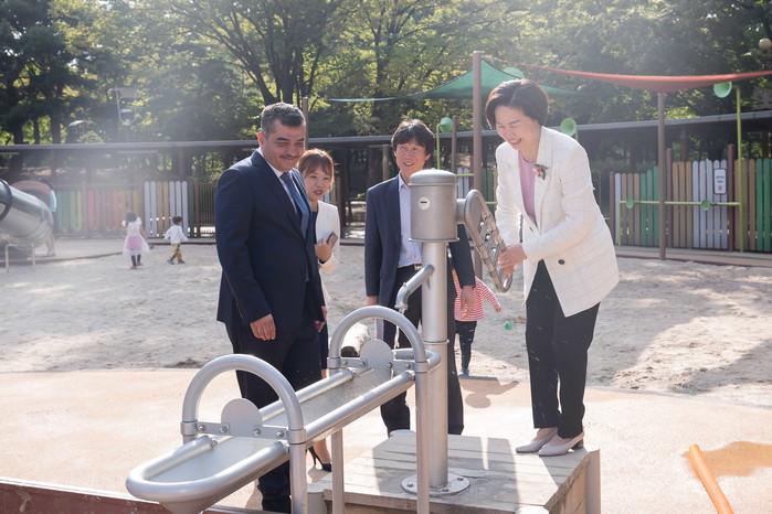 지난 23일 김수영 양천구청장이 우즈베키스탄 타슈켄트시 칠란자르구와의 우호교류를 위해 구를 방문한 막사메토프 칠란자르구청장과 함께 쿵쾅쿵쾅 놀이터 및 키지트, 생활안전체험관, U-양천 통합관제센터 등 지역내시설 견학을 실시했다. 사진은 놀이터를 방문한 김 구청장(오른쪽)이 놀이기구 시연을 하고 있는 모습. (사진제공=양천구청)