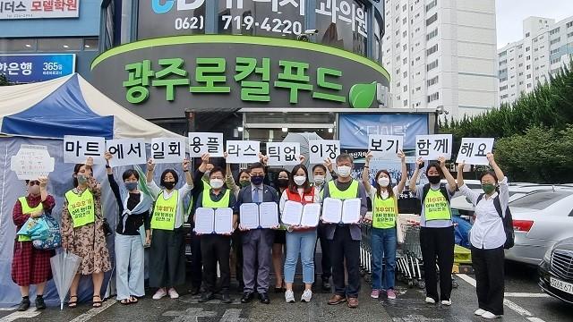 | ▲ 광주광역시, 광주형 자원순환시민실천 강화 사업 위해 광주자원순환협의체와 ‘로컬푸드 빅마트’의 ‘1회용·플라스틱 포장 줄이기 및 친환경 소비확산을 위한 자원순환 실천마트 업무 협약식’ 개최 / 사진=광주광역시 제공 |