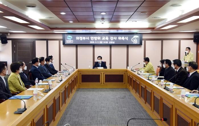 경기 의정부시는 최근 2020년 민방위 교육강사 16명에 대해 위촉장을 수여하고 내실 있는 교육을 논의하기 위한 간담회를 진행했다. 사진은 안병용 시장이 강사들과 이야기를 나누는 모습. (사진제공=의정부시청)