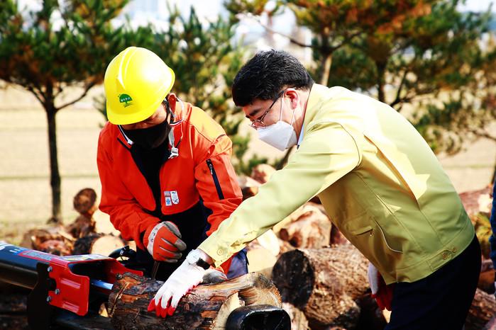 충남 서산시가 오는 10일까지 '땔감 나누기 행사'를 열고 숲 가꾸기 및 산림사업을 통해 생산된 목재 중 적당한 것을 알맞은 크기로 잘라 취약계층 68가구에 각 1톤의 땔감으로 지원한다. 사진은 4일 맹정호 시장(오른쪽)이 나눔할 땔감을 알맞은 크기로 자르는 모습. (사진제공=서산시청)