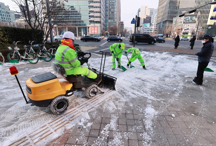 한파가 한풀 꺾인 12일 종로구 세종대로 인근에서 종로구청 관계자들이 보행로의 남은 눈을 도로로 밀어내 녹이고 있다.