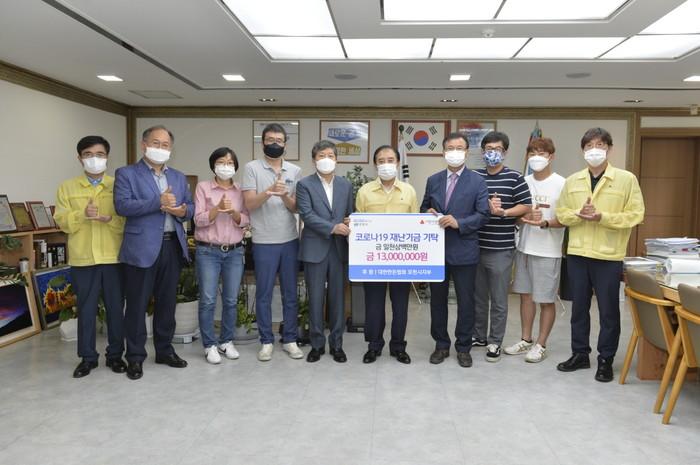 경기 포천시는 31일 대한한돈협회 포천시지부로부터 코로나19 극복을 위한 성금 1300만원을 기탁받았다. 사진은 기탁식에서 박윤국 시장(오른쪽에서 다섯 번째)과 관계자들이 기념촬영을 하고 있는 모습. (사진제공=포천시청)