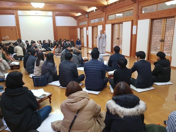서울 은평구가 최근 신규직원과 타 기관 전입 직원의 빠른 조직 적응과 건전한 공직관 형성을 위해 진관사에서 ‘멘토-멘티 힐링한마당’을 실시했다. 사진은 진관사 선우 스님의 지도로 차담회를 진행하고 있는 모습. (사진제공=은평구청)