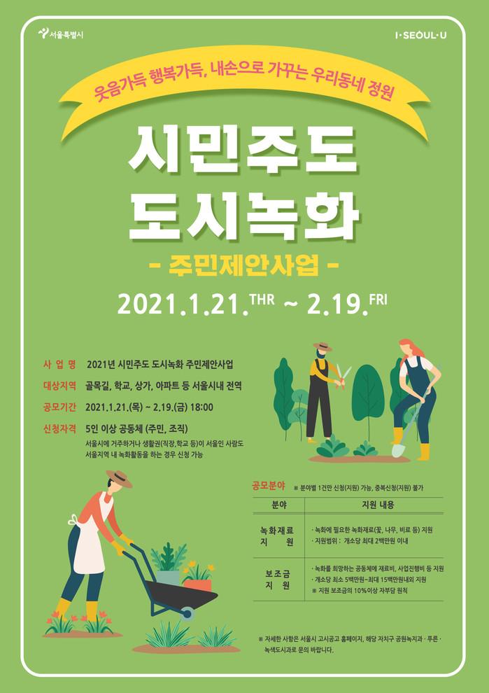 이 사업은 기존 ‘공동체정원 조성 주민제안사업’의 명칭이 바뀐 사업으로, 주민제안을 통해 5인 이상의 공동체에 녹화재료 또는 보조금을 지원해 시민들이 스스로 일상생활 속에서 꽃과 나무를 심고 가꾸는 문화를 정착하기 위한 사업이다.