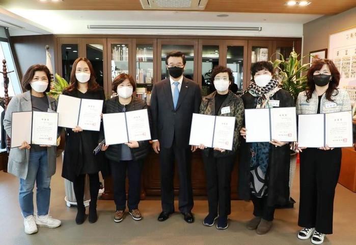 서울 용산구가 3일 ‘용산구 아동권리 구민강사’ 위촉식을 열었다. 위촉된 구민 강사진들은 향후 2년간 ‘찾아가는 아동권리 교육’ 강사로 지역내 학교와 아동 양육시설 등에서 전반적인 아동권리에 대한 교육을 진행하게 된다. 사진은 위촉식에서 성장현 구청장(가운데)이 참여자들과 기념촬영을 하고 있는 모습. (사진제공=용산구청)