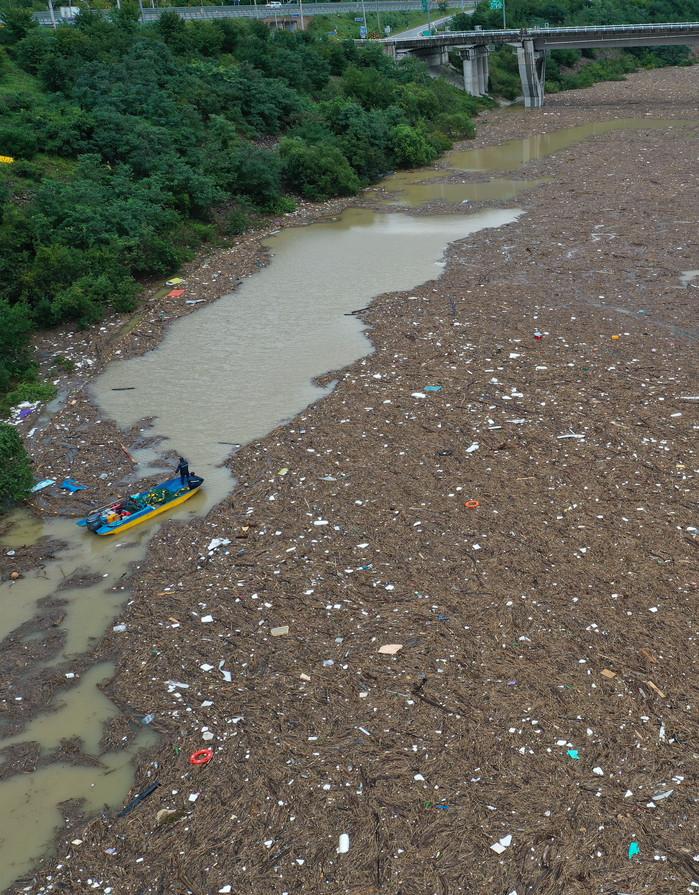 9일 오후 강원 인제군 남면 소양호 상류 일원이 지난 태풍에 떠내려온 부유물로 덮여 있다.