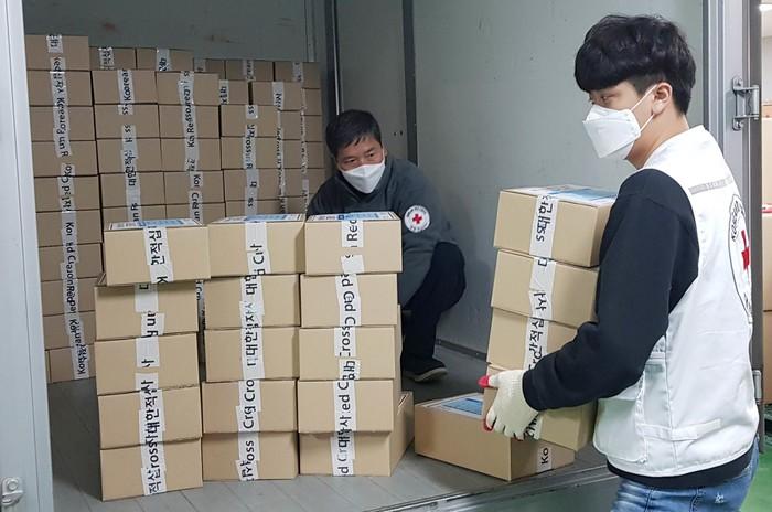 대한적십자사 서울시지사는 재난취약계층의 '코로나19' 감염 예방을 위해 지역내 쪽방촌에 긴급구호세트 500개를 지원했다. 긴급구호세트는 마스크 5개, 손소독제, 햇반 3개, 생수 2개 등으로 구성돼 있다. 사진은 긴급구호세트를 나르는 모습. (사진제공=대한적십자사 서울시지사)