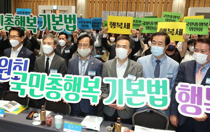 문석진 서대문구청장이 최근 전북 고창군 상하농원에서 열린 '행복정책 실현 촉구 공동선언문' 선포식에 참여했다. 사진은 문 구청장(앞줄 오른쪽 두 번째)과 참석자들이 국민총행복기본법 제정 등을 촉구하는 퍼포먼스를 선보이고 있는 모습. (사진제공=서대문구청)