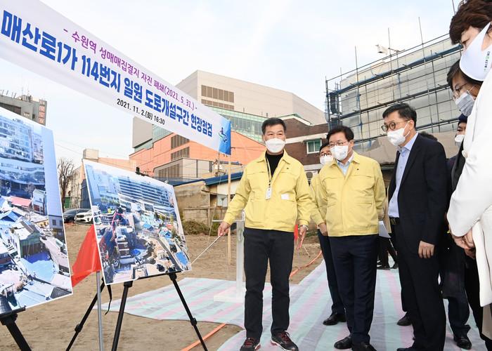 염태영 경기 수원시장이 2일 수원역성매매집결지 있었던 매산로1가 114번지에 소방도로를 조성하고, 화재 등 재난 사고에 대비할 수 있는 안전 체계를 만드는 소방도로개설공사 진행상황을 점검했다. 사진은 염 시장(왼쪽 두 번째)이 소방도로개설공사 현장에서 관계자의 보고를 받고 있는 모습. (사진제공=수원시청)