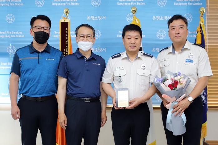 서울 은평소방서가 최근 서장실에서 서울도시가스로부터 ‘안전관리 유공표창’을 받았다. 사진은 홍봉준 서울도시가스강북지사장(왼쪽 두 번째)이 이창식 서장(오른쪽 두 번째)에게 표창장을 전달하고 기념촬영을 하고 있는 모습. (사진제공=은평소방서)