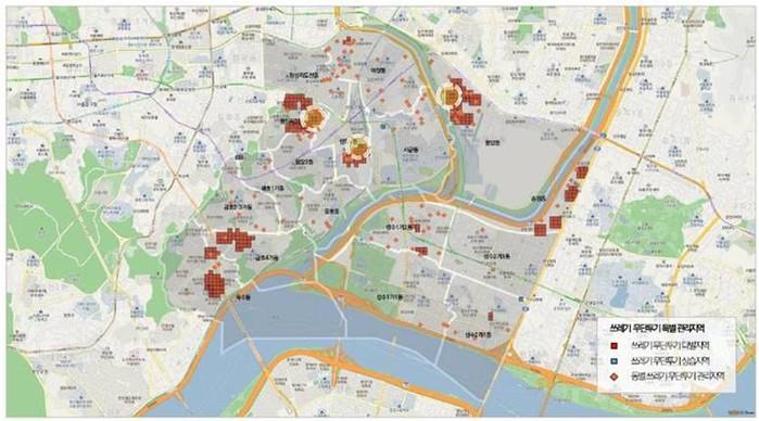 ▲ 빅데이터 분석 플랫폼을 통해 분석된 쓰레기 투기 관련 자료. (사진제공=성동구청) |