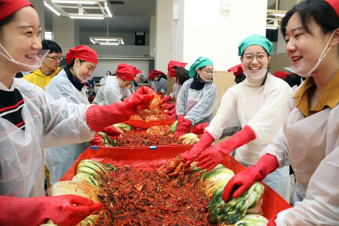7일 이화여대에서 '사랑의 김장 나누기' 행사가 열려 학생, 교직원, 봉사자들이 어려운 이웃에게 전달할 김장김치를 만들고 있다.