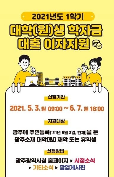 [광주=정찬남 기자] 광주광역시는 오는 6월7일까지 2021년도 1학기 대학(원)생 학자금대출 이자지원 신청을 접수한다.