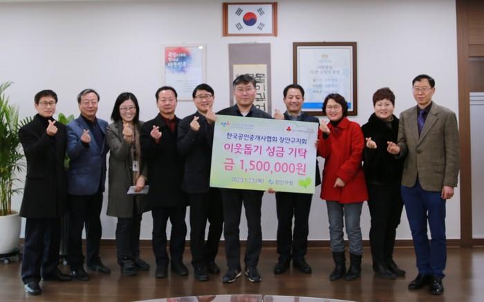 한국공인중개사협회 장안구지회는 최근 어려운 이웃을 돕는 데 써달라며 경기 수원시 장안구청에 150만원을 기탁했다. 매년 이웃돕기 성금 기탁과 자원봉사활동 참여 등 따뜻한 지역사회를 만드는 데 앞장서온 한국공인중개사협회 장안구지회는 현재 480여명의 회원으로 구성돼 있다. 사진은 관계자들이 기념촬영을 하는 모습. (사진제공=장안구청)