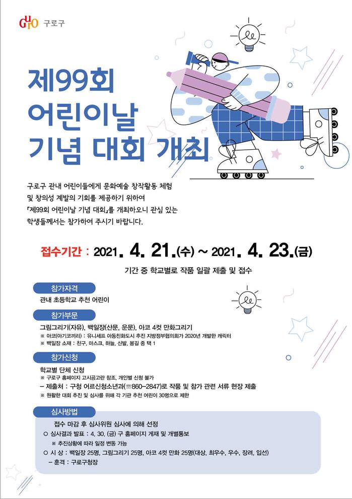 [시민일보 = 이대우 기자] 서울 구로구(구청장 이성)가 ‘제99회 어린이날’을 맞아 21~23일 비대면 어린이날 행사를 개최한다.