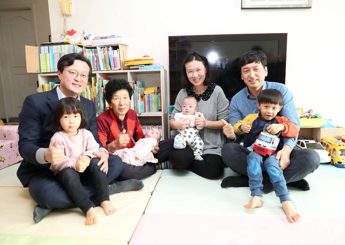 채현일 영등포구청장이 1일 새해를 맞이해 출산 장려와 육아 애로사항 등을 청취하기 위해 4살 쌍둥이와 1살 쌍둥이 사남매가 살고 있는 '겹쌍둥이 가정'에 방문했다. 사진은 채 구청장(왼쪽)이 다둥이 가족과 함께 기념촬영을 하는 모습. (사진제공=영등포구청)