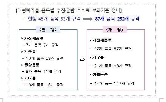 이에 이번 조례 개정으로 8월 1일부터는 대형폐기물 종류가 현행 45개 품목 63개 규격에서 87개 품목 252개 규격으로 대폭 늘어난다. ‘가전제품류’는 기존 7개에서 22개로, ‘가구류’는 16개 품목에서 21개로, ‘생활용품류’는 9개에서 44개 품목으로 각각 세분화된다.