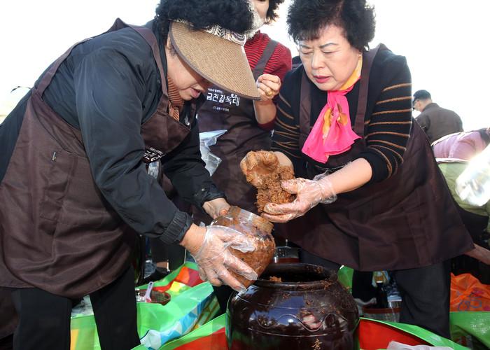 금천구는 최근 보건소 6층 하늘정원에서 장나누기 행사를 개최했다. 이번 장나누기 행사는 지난 2월 진행한 ‘금천장독대’ 프로그램의 마지막 일정으로 참여자들은 2월 ‘장담그기’, 4월 ‘장가르기’를 거쳐 이날 숙성된 장을 분양하고 맛을 평가하는 시간을 보냈다. 사진은 참여자들이 자신들이 담근 장을 나누고 있는 모습. (사진제공=금천구청)