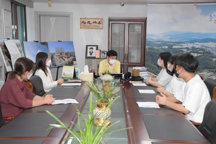 경기 동두천시는 18일 청소년정책 제안에 대한 청소년 의견을 청취하기 위해 ‘2021년 동두천시 청소년참여위원회 간담회’를 개최했다. 청소년참여위원회는 이날 간담회에서 ‘청소년 문화생활 증진의 필요성 제기’ 등 선정된 3개의 대표제안서 내용을 설명했다. 사진은 간담회에서 최용덕 시장이 청소년참여위원들과 대화를 나누고 있는 모습. (사진제공=동두천시청)