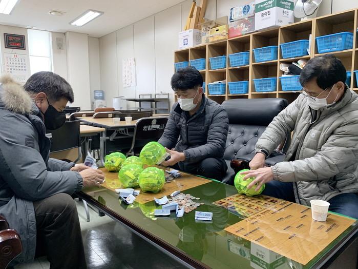 충남 아산시 온양3동 홍두깨칼국수가 지난 11일 모금한 약 34만원의 동전이 담긴 저금통 9개를 지역내 취약계층에 전해달라며 온양3동 행복키움추진단에 전달했다. 사진은 행복키움추진단 관계자들이 홍두깨칼국수에서 기부한 저금통에 있는 돈을 모으고 있는 모습. (사진제공=아산시청)