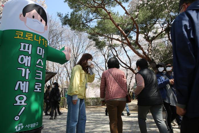 코로나19 확산으로 사회적 거리두기 운동이 시행되고 있는 가운데 서대문구청 직원들이 최근 안산(鞍山) 연희숲속쉼터 부근에서 시민들을 대상으로 마스크 착용과 거리두기를 안내했다. 사진은 직원들이 시민들에게 마스크 착용을 당부하는 모습. (사진제공=서대문구청)
