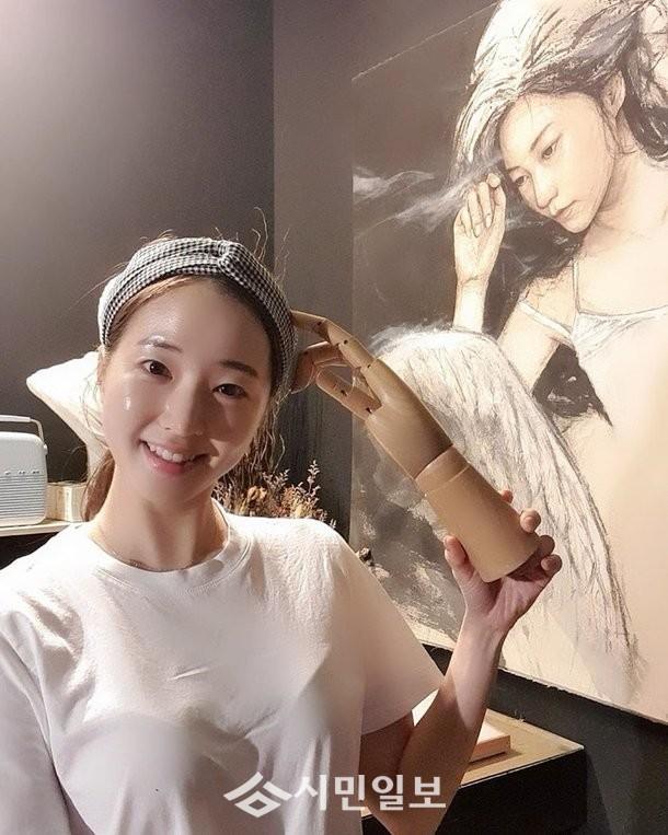 사진 속 유다솜은 손 조형물을 가지고 머리를 긁는 듯한 포즈를 취해 웃음을 자아냈다. 그는 투명한 피부와 사랑스러운 미소를 시선을 사로잡기도 했다.