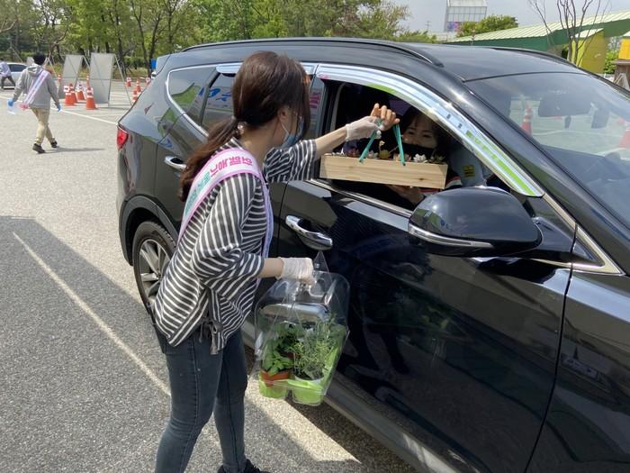| ▲ 사진설명 : 고양시 대표 화훼인 다육 세트 등을 드라이브 스루를 통해 구매하고 있다. |