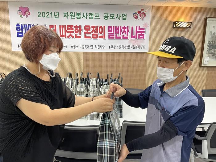 서울 광진구 중곡2동 주민센터가 최근 자원봉사캠프와 함께 ‘더 따뜻한 온정의 밑반찬’ 나눔 행사를 열어 직접 만든 밑반찬을 저소득 중장년 1인가구 25명에게 전달했다. 사진은 대상자에게 밑반찬을 전달하고 있는 모습. (사진제공=광진구청)