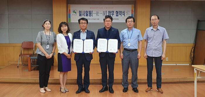최근 서울 은평구 불광1동 주민센터와 은평치과의원이 최근 불광1동주민센터에서 ‘의료안전망 구축을 위한 일사일동(一社一洞)업무협약’을 체결하고, 불광1동 의료 취약계층의 진료비 감면 혜택을 제공하기로 했다. 사진은 협약 후 기념촬영을 하고 있는 모습. (사진제공=은평구청)