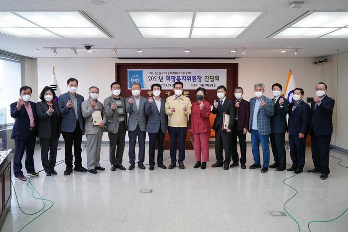 서울 동대문구가 최근 ‘2021년 동희망복지위원장 간담회’를 개최했다. 간담회에서는 14개동 민간위원장의 노고를 격려하고, 나눔활동이 많은 답십리2동·장안1동·이문1동·이문2동 등 4개동의 위원장에게 표창장을 수여했다. 사진은 간담회에서 유덕열 구청장(가운데)이 민간위원장들과 기념촬영을 하고 있는 모습. (사진제공=동대문구청)