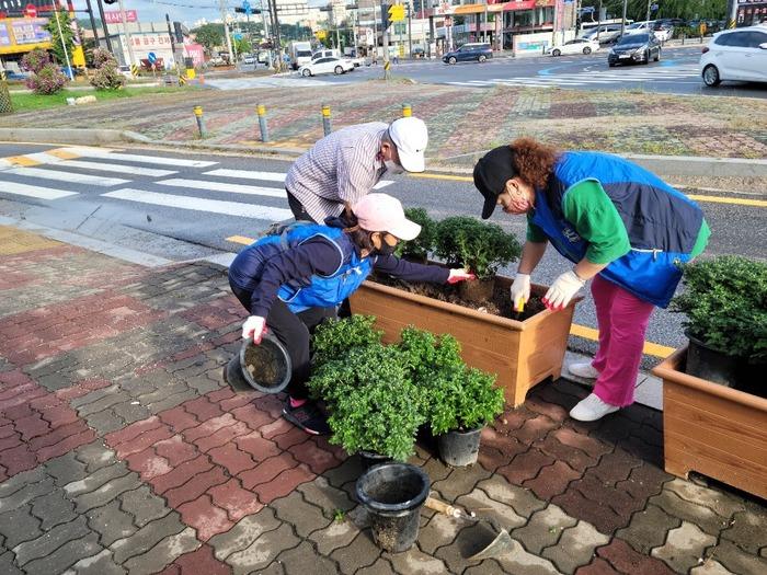 경기 의정부시 송산1동 주민센터는 8일 지역내 자생단체 회원들과 만가대 교차로~영석고등학교의 시민로 구간 가로수마다 보호화분을 배치하고, 계절꽃인 국화를 심는 가을철 아름다운 꽃길 가꾸기를 진행했다. 사진은 이날 봉사자들이 국화를 심고 있는 모습. (사진제공=의정부시청)