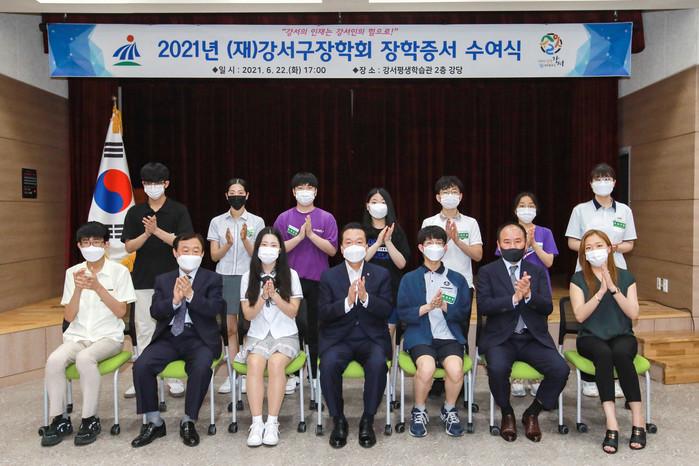 노현송 서울 강서구청장이 지난 22일 ‘2021년 (재)강서구장학회 장학증서 수여식’에 참석해 학생들을 격려했다. 이날 (재)강서구장학회는 학업 성적이 우수한 학생 66명을 선발해 총 1억4600만원을 지원하기로 했다. 사진은 수여식에서 노 구청장(앞줄 가운데)이 장학생으로 선발된 학생들과 기념촬영을 하고 있는 모습. (사진제공=강서구청)