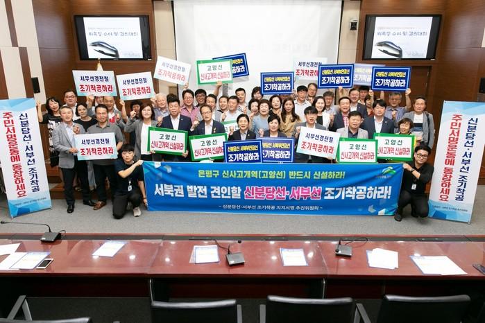 | ▲ 지난해 8월 은평구청에서 열린 신분당선·서부선 조기착공 촉구 결의대회. (사진제공=은평구청) |