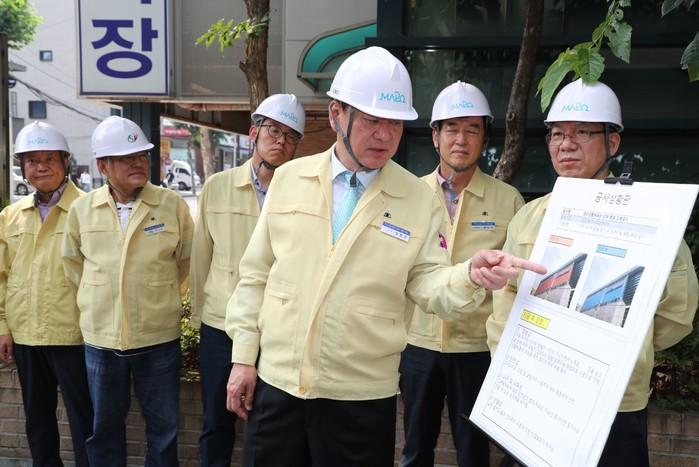유동균 마포구청장이 17일 마포구 염리생활체육관 외벽패널 교체공사 현장을 방문 점검했다. 사진은 유 구청장(가운데)이 현장에서 공사상황판을 보고 있는 모습. (사진제공=마포구청)