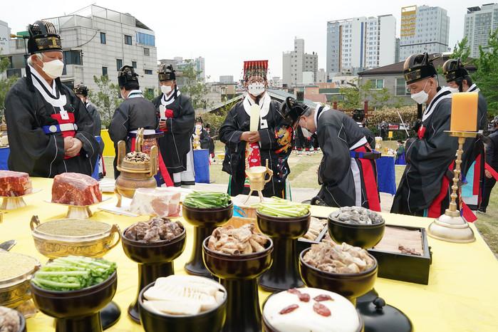 동대문구는 지난 24일 서울 선농단에서 대한민국 농사의 시작을 알리는 ‘2021년 선농대제’를 무관중으로 개최했다. 이날 선농대제는 풍년기원뿐 아니라 코로나19 극복을 기원하며 제례봉행만 진행했다. 사진은 2021 선농대제에서 제례봉행을 하고 있는 모습. (사진제공=동대문구청)