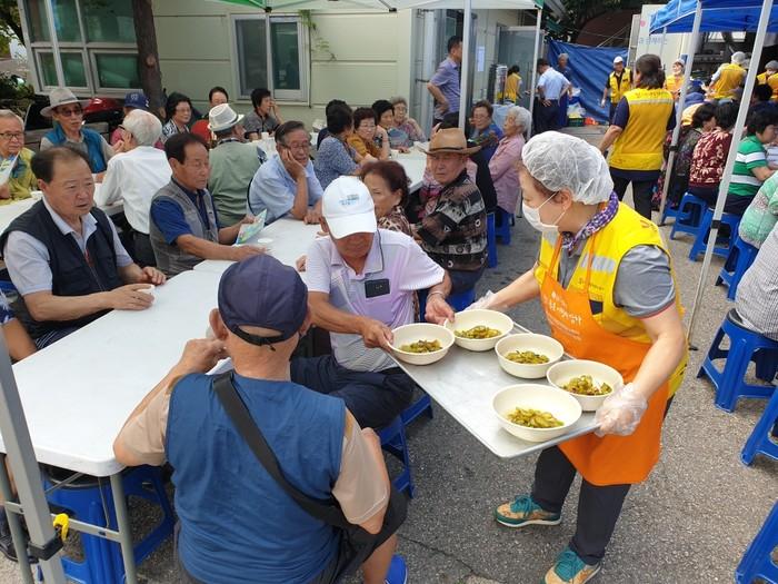 경기 수원시 팔달구 지동에서는 최근 행정복지센터 주차장에서 수원시자원봉사센터 주관으로 홀몸노인 300여명에게 ‘사랑의 밥차’ 봉사활동을 실시했다. 사진은 봉사자들이 노인들에게 음식을 전달하고 있는 모습. (사진제공=팔달구청)
