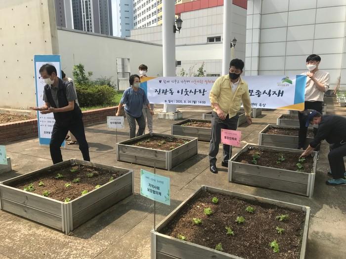 서울 은평구 진관동 주민센터는 지난 24일 주민센터 옥상 텃밭에서 '이웃사랑 모종 식재 행사'를 열었다. 이번 행사에서는 상자텃밭 20개와 화단 등을 활용해 김장무, 상추 모종 200여본과 각종 씨앗 등을 심었다. 사진은 행사 참여자들이 모종을 식재하고 있는 모습. (사진제공=은평구청)