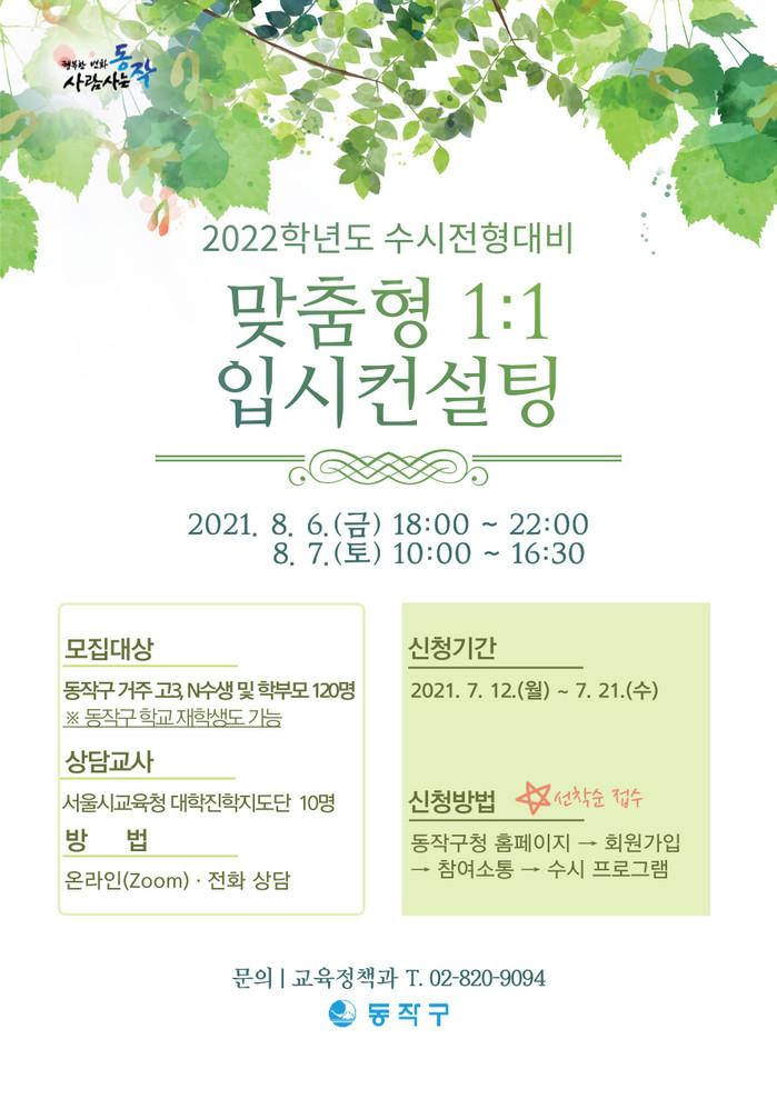 [시민일보 = 여영준 기자] 서울 동작구(구청장 이창우)가 온라인 비대면 ‘2022학년도 수시전형 대비 맞춤형 1:1 입시컨설팅’ 참여자를 모집한다고 12일 밝혔다.