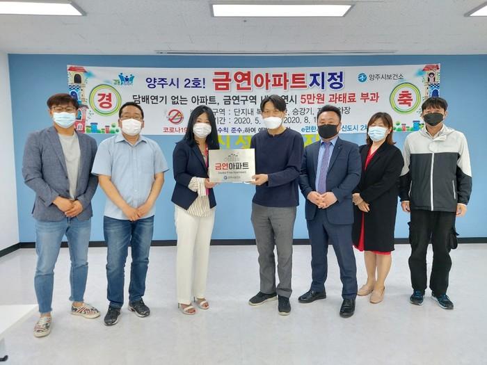 경기 양주시가 12일 시 건강생활지원센터에서 금연아파트 지정식을 열고 'e-편한세상 양주신도시 2차 아파트'를 지역내 제2호 금연아파트로 지정했다. 사진은 명패를 전달한 후 관리소장, 입주자대표회의 임원, 관계 공무원 등이 기념촬영하는 모습. (사진제공=양주시청)