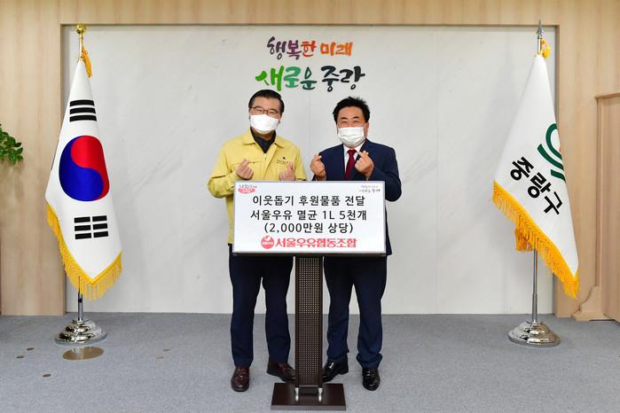 서울 중랑구는 최근 서울우유협동조합으로부터 서울우유 멸균 1리터 5000개(2000만원 상당)를 기탁받았다. 기탁받은 후원물품은 사회복지시설을 통해 저소득 주민들에게 전달될 예정이다. 사진은 전달식에서 류경기 구청장(왼쪽)과 관계자가 기념촬영을 하고 있는 모습. (사진제공=중랑구청)