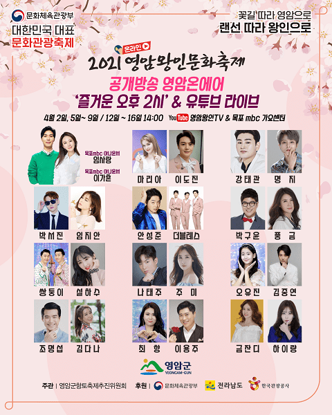 주민이 참여하는 축제를 위해 영암군 향토축제추진위원회는 11일간 읍·면 마을이야기를 공개방송 온에어 ‘즐거운 오후 2시’에서 소개한다. 11일간 읍·면의 날을 지정하고 지역민 스토리텔러가 출연해 마을의 연혁과 유래, 대표 음식과 특산물, 관광지 등을 자랑하고 흥겨운 가수들의 공연도 함께 선사한다.