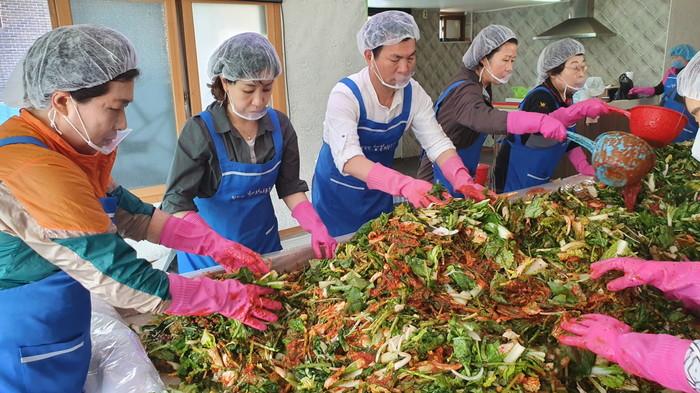 충남 아산시 탕정면 및 행복키움추진단은 지난 6일 행복키움추진단원 30여명과 동산 1리 마을주민 5명의 협력으로 '사랑의 열무김치 나눔' 행사를 진행했다. 사진은 참여자들이 열무김치를 담그고 있는 모습. (사진제공=아산시청)