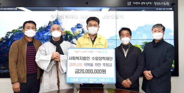 서울 노원구는 24일 구청장실에서 사회복지법인 수암장학재단으로부터 코로나19로 극복을 위한 후원금 2000만원을 전달받았다. 사진은 오승록 구청장(가운데)과 수암사 주지스님, 수암사 장학재단 임원진 등이 함께 기념촬영을 하는 모습. (사진제공=노원구청)