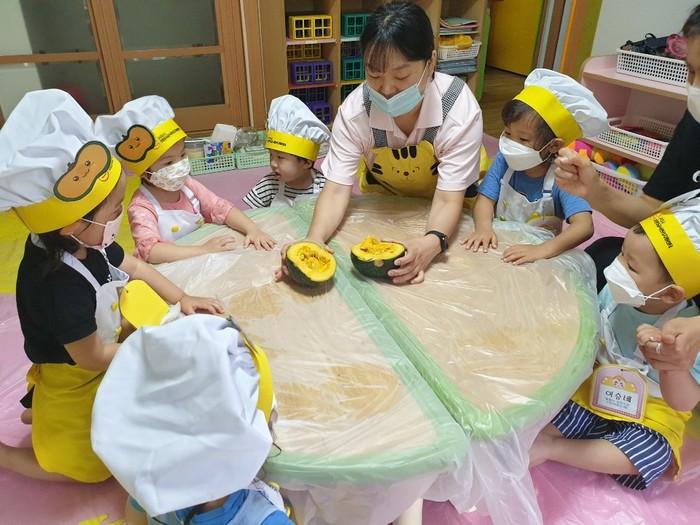 경기 구리시어린이급식관리지원센터가 오는 10월까지 '냠냠! 킁킁! 무슨 채소일까?' 어린이 방문교육을 실시한다. 이번 교육에서는 식재료를 활용한 오감활동, 자기 주도적인 요리·미술 활동 등을 진행한다. 사진은 단호박을 주제로 센터 가입 어린이시설 유아들에게 교육을 진행하고 있는 모습. (사진제공=구리시청)